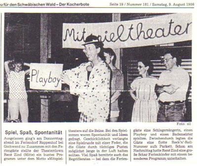 Viel Spaß bereitete auch das Begrifferaten – bei dem die Feriengäste eine Schlagersängerin, einen Playboy und einen Bademeister spielten. Zwischendurch legten die Gäste eine flotte Rock´n-Roll-Nummer aufs Parkett. Schon am Nachmittag hatte René Zind eine große Schar Ferienkinder mit einem besonderen Programm unterhalten. (aus: Rundschau für den Schwäbischen Wald – Der Kocherbote 09.08.1986)