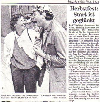 Innenstadt Bad Vilbel, Samstag, kurz nach der Mittagszeit. Die Frankfurter Straße ist für den Autoverkehr gesperrt. Im roten Regencape und mit roter Clownsnase wandert René Zind über die „Fußgängerzone“. In der linken Hand hält er einen Spiegel, in der rechten einen roten Schminkstift. „Du brauchst eine rote Nase. Das sehe ich dir an“, sucht er das Gespräch mit den Passanten und malt ihnen flugs einen roten Punkt auf die Nase – Herbstfest in Bad Vilbel. René Zind ist einer der „Programmpunkte“, die der Gewerbering für das erste Fest dieser Art wählte. „Ich sorge für bunte Farbtupfer an diesem grauen Tag“, erklärt der Clown... (aus: Frankfurter Neue Presse 09.10.1989)
